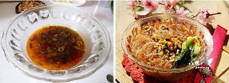 12、再将粉和油菜捞入酸辣碗汁中,加入鸡精调味即可。