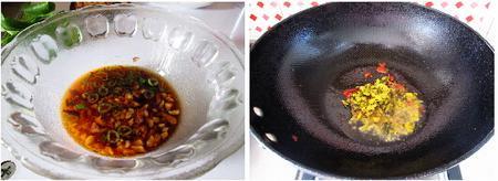 8、另起锅,注入油下入郫县辣酱炒出红油后倒入酸菜粒煸炒均匀。