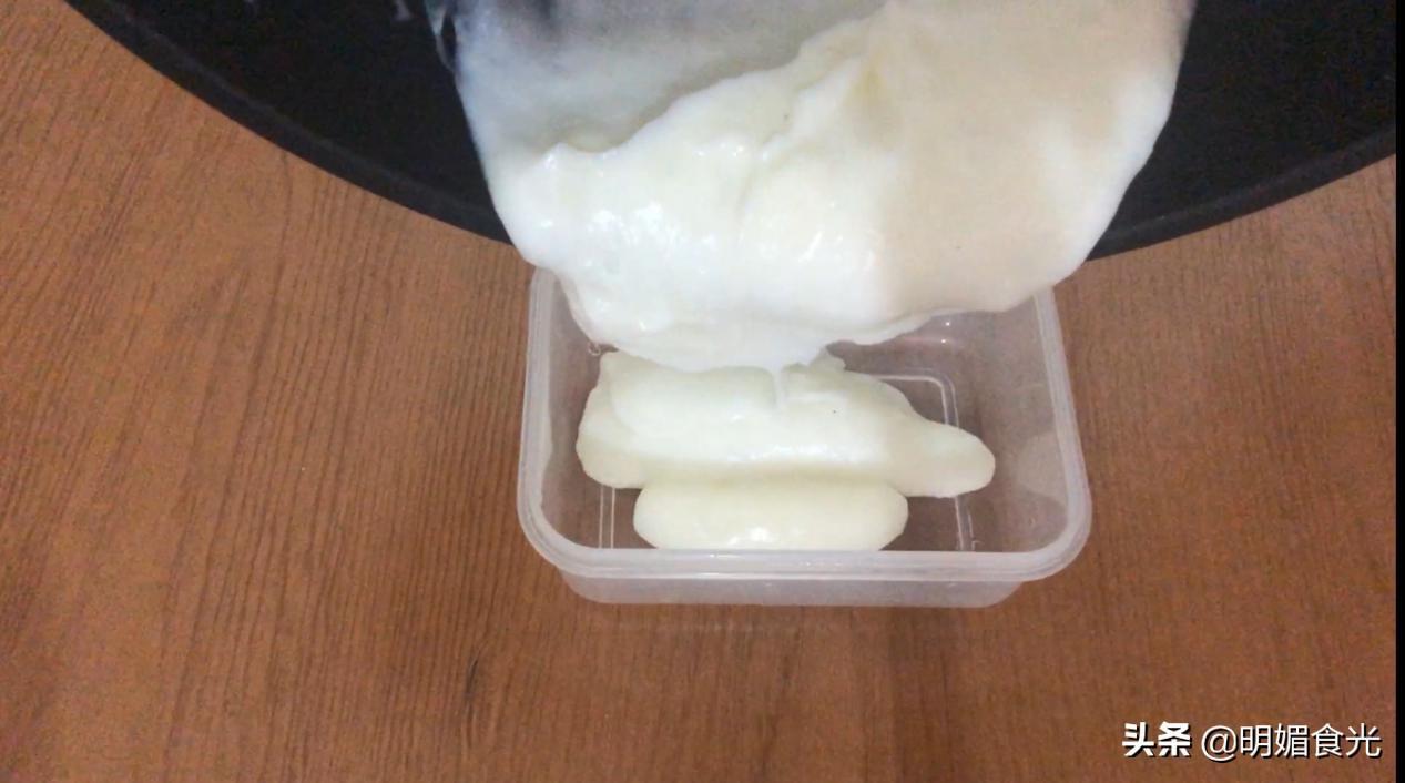 第二步:将变成糊状的酸奶倒入保鲜盒中,放入冰箱冷藏2个小时,直到酸奶固体成型,再取出。