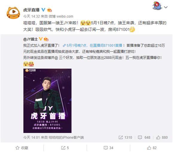 消息刚一放出,就吸引了一大批粉丝在JY微博评论和超话下展开了热烈的讨论。JY与前合作平台熊猫直播的签约将近尾期,而JY并不打算在熊猫续约。在收到了各大直播平台的邀约后,JY毫不犹豫的选择了虎牙。在全网直播平台和视频网络风靡之时,JY的坚定选择也显示出他“狼王”的高情商和高智商。