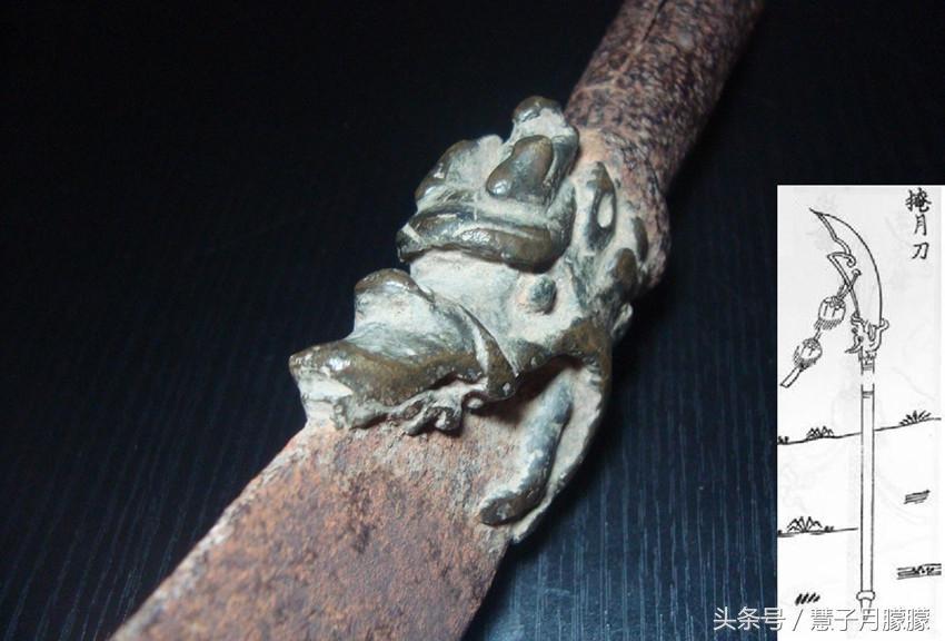 掩月刀。宋代“刀八色”之一,为骑兵装备的一种战刀,这是关公刀中唯一的实战刀。此刀由西汉“斩马刀”演变而来,刀身阔长,形如关弦月,背有歧刃,刀身穿孔垂旄,刀头与柄连接处有龙形吐口,无明显刀镡,长杆末有鐏。经刀劈砍能力非常强大,但因刀身较重,故多为猛将所用。南宋抗金名将岳飞,除了使枪外,还善使大刀,岳珂著《鄂王行实编年》:“先臣以刀承之,刃入寸余,复拔刀击之,斩其首,尸仆冰上。”又“贼魁出斗, 某驰骑独往,奋大刀劈之,自顶至腰分为两,数万众不战而溃”,“趁敌阵未定单骑突入虏阵,斫其骁将,敌遂披靡。”岳飞一刀将敌将连盔带甲劈为两半,后人称之为“一刀惊万军”。