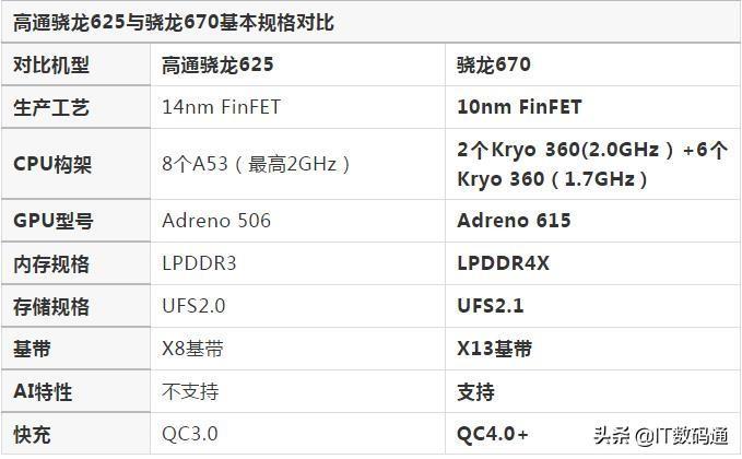 去年高通在中端移动平台可谓发力了,不仅发布了高通骁龙670处理器,还发布了高通骁龙710处理器。通过前面的介绍相信大家对骁龙670处理器有了一定了解,能否成为一代神U需要时间的考验。今天“IT数码通”小编为大家带来了骁龙625和670区别对比,想知道高通骁龙670和625哪个好的小伙伴赶紧看看吧,详情如下。