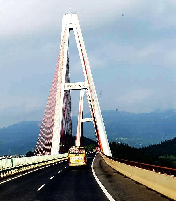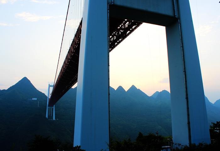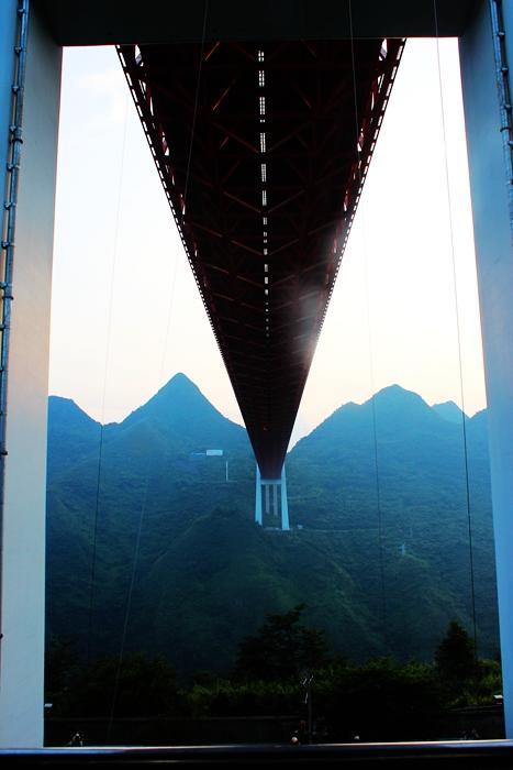 我是有恐高症的,别说370米?站在10层高的楼房朝下看的时候,双腿便开始自行颤抖,土话说,叫“打飊”,心理微微发慌。那个滋味儿不是自己能控制住的,而是大脑皮层神经质面对高处,一种捍卫自己身体的本能反应。但为了观赏中国制造的坝陵河大桥,我还是不顾一切,也随大家乘电梯爬上桥梁的最高端,游览大桥。
