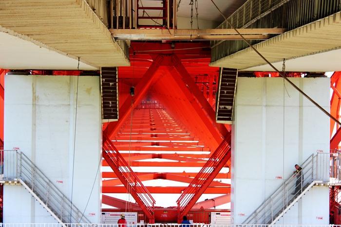 高大的桥梁从头顶越过,钢筋水泥筑成高耸而厚重的桥墩,厚厚的钢板连接着桥梁的每一个关键部位,将大桥结构紧密地连接在一起。每一个连接处都安装有数十枚、上百枚环环紧扣的螺丝母。有一处连接点,我数了数共有68枚螺丝固定。