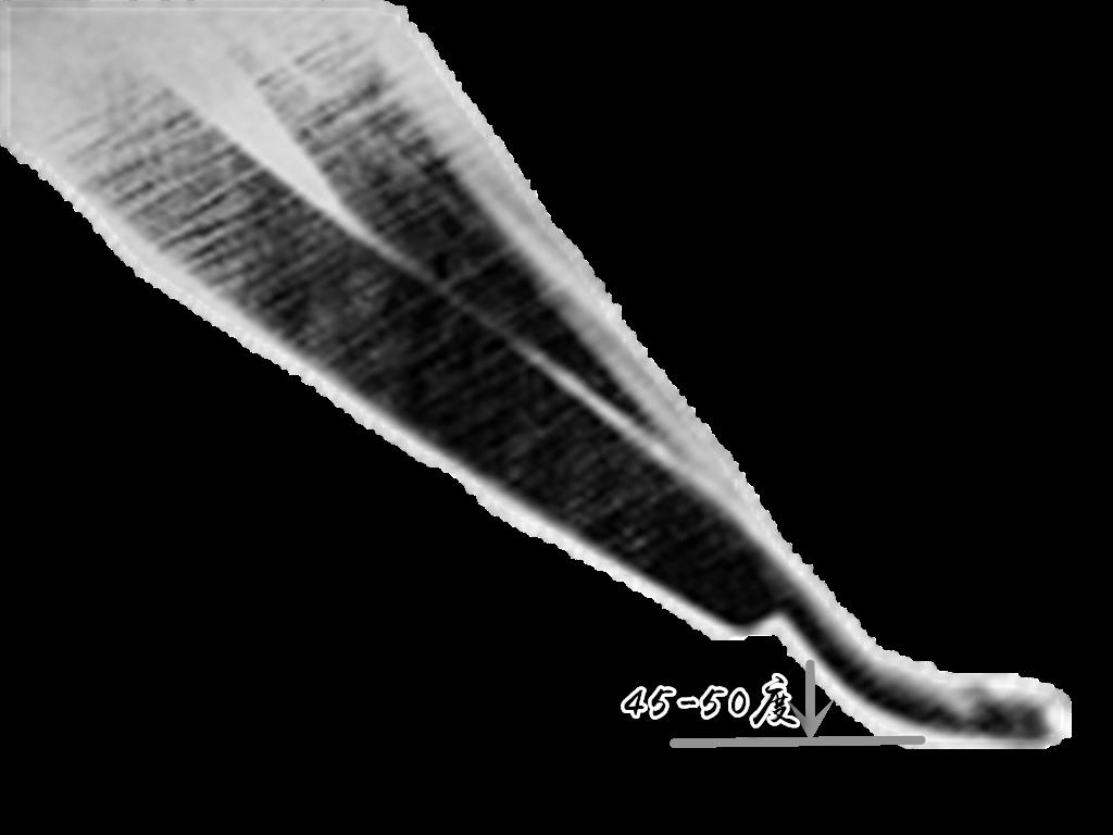 弯曲角度越大,在写粗笔画的时候越省力,但在我们日常书写中,基本都是在2里米以下的字居多,所以用到粗笔画的时候不是太多,于是就要在行笔方式上不断的调整,太弯会使用笔过程中调整的幅度过大,久之会让自己身心俱疲。太大的角度也会让笔画的边缘太过锋利或者毛糙,缺乏一种字体的端庄。