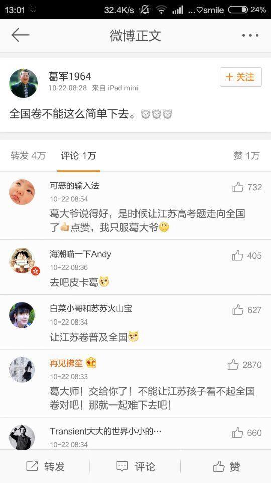 这一条微博,犹如高考界的一场大地震啊,使用全国卷的学子们,人人自危,说不准就着了葛军的道。可实际上,葛大爷曾经声明过,他没有个人微博,他也知道网上有个叫“葛军1964”的微博,但那不是自己;博主也出来道过歉,说自己并不是葛军大爷。