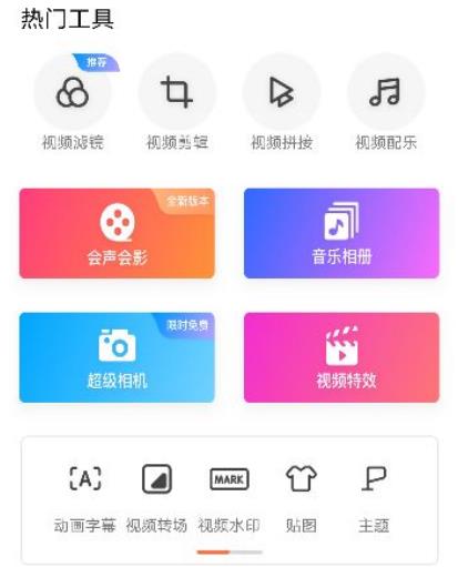 3、进入热门工具,视频滤镜、视频剪辑、视频拼接、视频配乐都是可以免费使用的;还有特色功能:会声会影、音乐相册、超级相机、视频特效等;底部还有动画字幕、视频转场、视频水印、贴图主题。