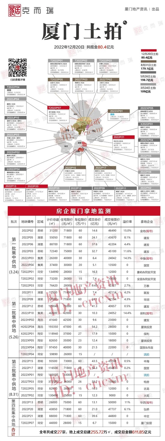 4宗地块共吸引了建发、联发、中海、港务、华润、安居、中交、保利、国贸等房企到场竞逐,所有地块均成功出让,合计揽金80.4亿元。(后附2022年厦门全年土拍结果一览)