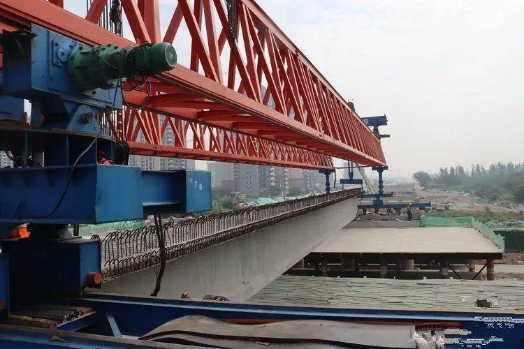 南湖特大桥位于国道G107项目K52+220.083处,同时跨中华大街和滏阳河,全长1367.85米。该处41米预制T梁为邯郸市有史以来同等截面积最长预制T梁,具有跨度大、架设困难等特点,同时中华大街人流量大,为最大程度避免施工期间影响市民出行,市交通运输局公路工程管理处和国道G107项目各参建单位高度重视,精心组织,在南湖特大桥跨中华大街处设置安全通道,保证快速、安全的完成41mT梁架设任务,该跨T梁架设完成对于南湖特大桥施工进度具有里程碑式意义。