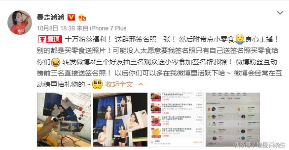微博原文:十万粉丝福利! 送辟邪签名照一张! 然后附带点小零食[摊手]良心主播!别的都是买零食送照片!可能没人太愿意要我签名照只有自己送签名照买零食给你们 转发微博@三个好友抽三名观众送小零食加签名辟邪照! 微博粉丝互动榜前三名直接送签名照! 以后你们可以多在我微博里活跃下哈~ 微博会经常在互动榜里抽礼物的~
