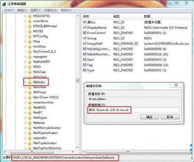 3、在“services”文件夹中找到并点击“Ndisuio”,点击后在窗口右侧找到并双击打开“DisplayName”,查看数据数值是否为“NDIS Usermode I/O Protocol”;