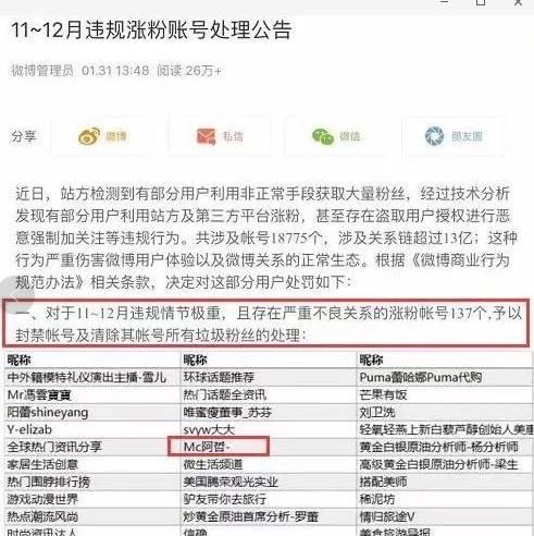 昨日下午,新浪官方的微博管理员发布11月~12月违规涨粉账号处理公告。在137个违规账户的名单里,赫然出现了咱YY主播阿哲的名字。