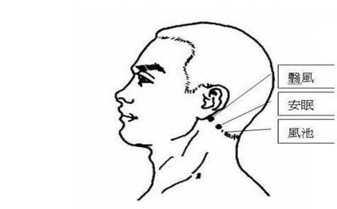 取穴方法:患者取俯卧位或侧伏位,安眠穴位于项部,当翳风穴和风池穴边线的中点。