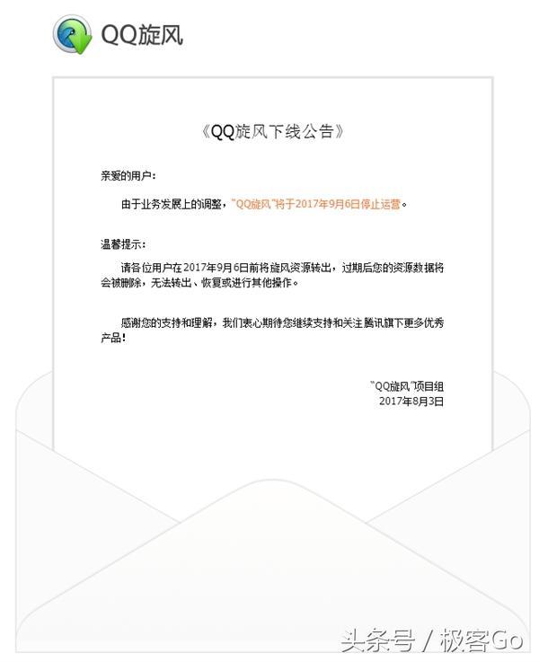 QQ旋风官方表示,请各位用户在9月6日前将旋风资源转出,过期后资源数据将会被删除,无法转出、恢复或进行其它操作。目前QQ旋风官网已经删除了软件下载地址,不过用户仍可以通过第三方商店下载使用该应用。