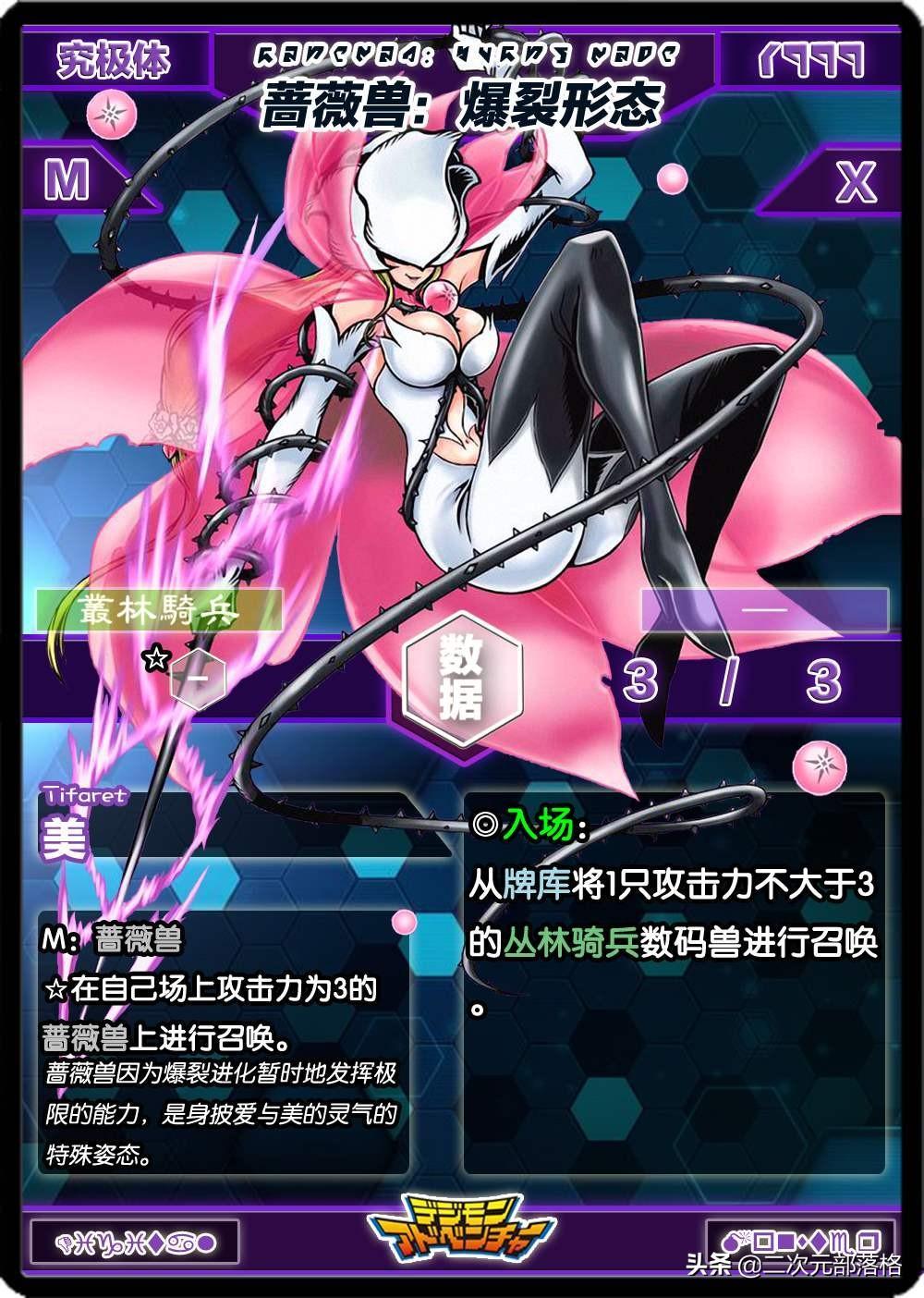 终于到了大御姐蔷薇兽了,作为能够竞争女性数码兽前五行列的数码兽,皮裤皮衣高跟鞋,手上还有着一根长鞭,能够满足绝大多数人的幻想,毕竟这种身材火爆的御姐人气都是很高的。