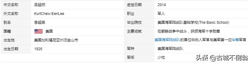 吕超然(英语:KurtChew-EenLee,或译为李超英,1926年-2014年),生于美国加州旧金山,美国人,是美国海军陆战队的首位非白人军官与美军第一位华裔军官。在1950年9月,吕超然与他的兄弟,因在朝鲜战争中的英勇战绩,获颁海军十字勋章。