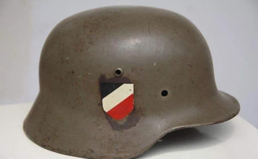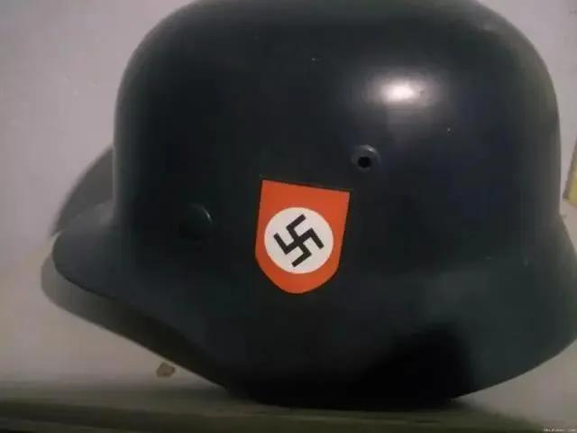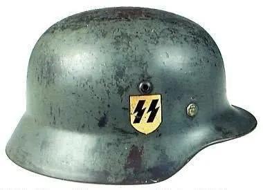 三、在头盔上如何区分国防军与党卫军;党卫军头盔上印闪电符号和纳粹标示,国防军头盔上会印有“普鲁示鹰”和三色标志。