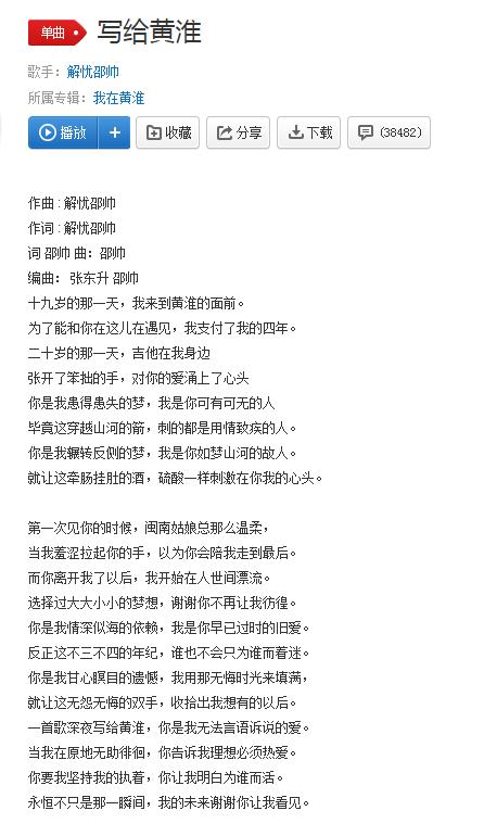 《写给黄淮》这首歌是解忧邵帅作词、作曲演唱的一首歌。这首歌创作出来就在黄淮学院迅速传开,随后上传到网络,就开始爆红,多家音乐平台播放量破千万,评论过万。当下最火的小视频抖音平台也有许多人翻唱。流行榜单名居前茅。