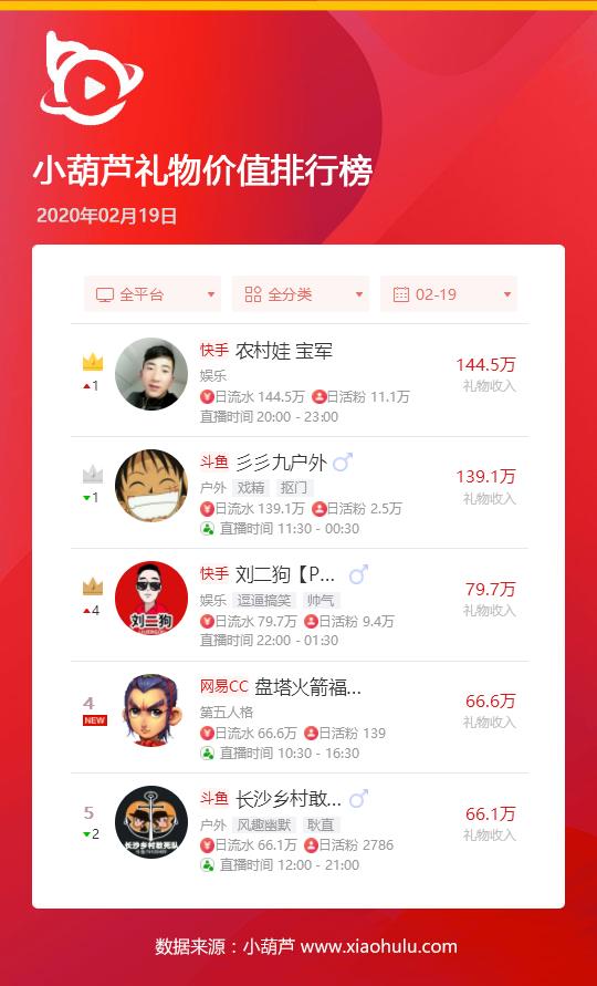 02月19日小葫芦礼物收入排行榜,快手、斗鱼和网易CC三平台主播上榜。快手农村娃宝军单日礼物收入高达144.5万元位居全平台首位,斗鱼彡彡九户外相差不大,以礼物收入139.1万元位居第二位。快手刘二狗、网易CC盘塔火箭福利一万,斗鱼长沙乡村敢死队单日礼物收入均不低于66.1万元上榜。