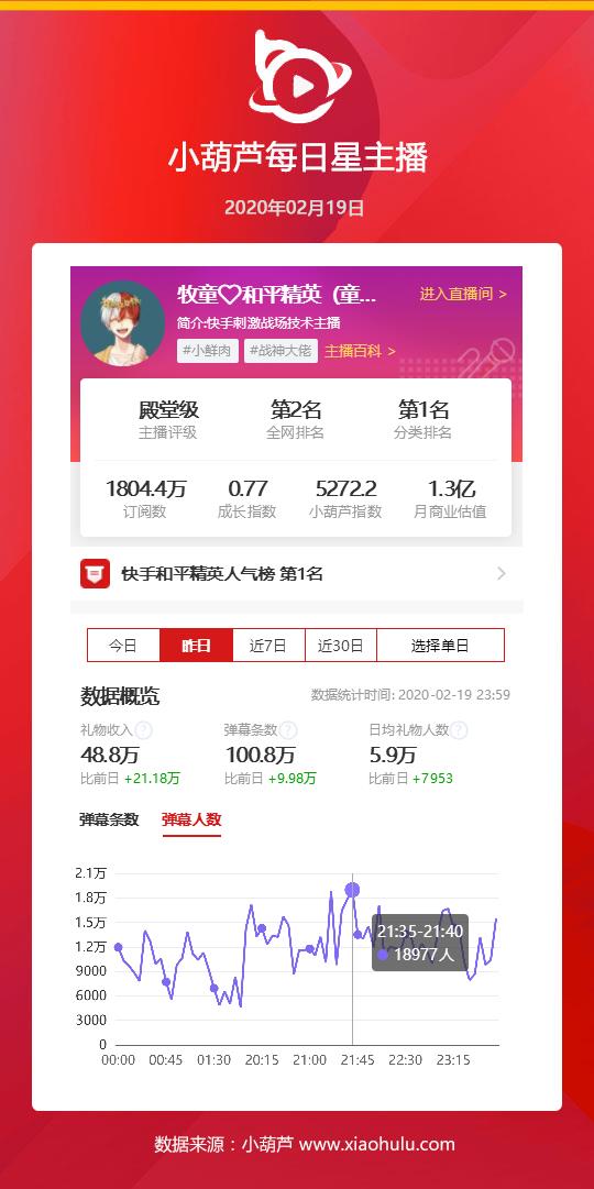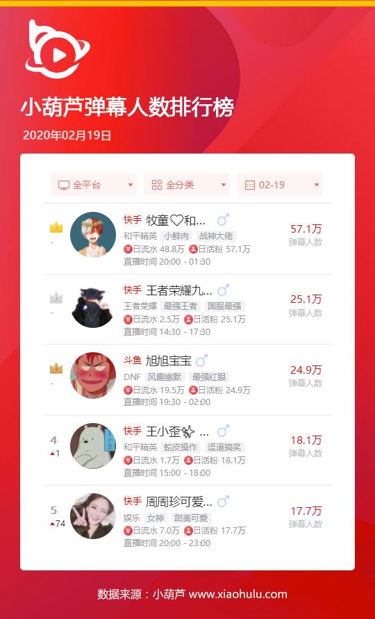 02月19日小葫芦弹幕人数排行榜,快手和平精英主播牧童再度凭借直播间的高热度登上弹幕榜榜首,单日弹幕人数57.1万人,王者荣耀九天狐位居第二位,单日弹幕人数25.1万人。斗鱼旭旭宝宝单日弹幕人数24.9万人位居第三位,也是斗鱼唯一上榜的主播。快手王小歪和周周珍可爱分别位居第四和第五位,单日弹幕人数不低于17.7万人。
