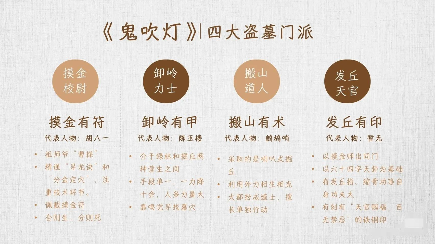 《鬼吹灯》1和2共8本书中,提到的是摸金、卸岭、搬山和发丘四个门派。摸金有符,卸岭有甲,搬山有术,发丘有印。还有淘沙有诀,观山有镜。