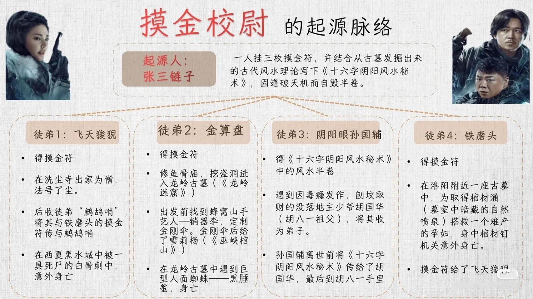 张三链子共收四个徒弟,老大飞天狻猊,老二金算盘,老三阴阳眼孙国辅,老四铁磨头。张三链子将《十六字阴阳风水秘术》传给孙国辅,将三枚摸金符给了另外三人。