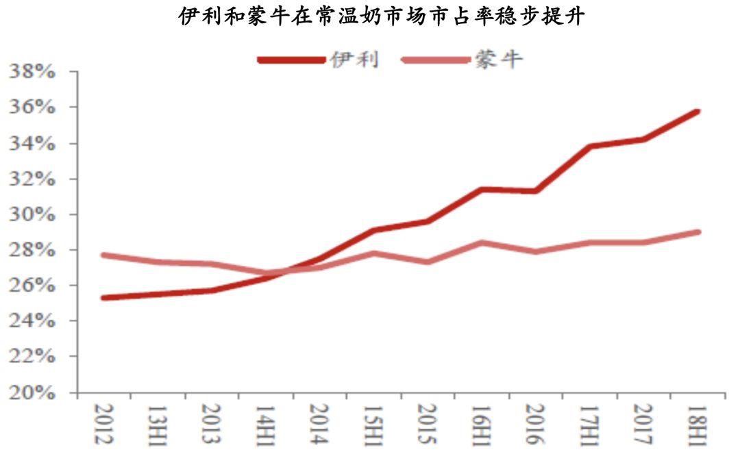 乳制品有常温和低温之分,国内市场目前以常温产品为主,比重超过80%。伊利和蒙牛如同两个巨无霸占据着常温奶市场,根据尼尔森的统计数据显示,两者合计市占率在65%以上,并且逐年提升,愈发强大。