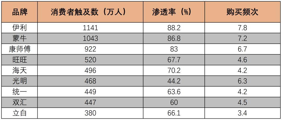 根据凯度消费者指数发布的《2017 品牌足迹报告》,食品饮料行业中伊利、蒙牛双双成为中国消费者选择最多的品牌。购买伊利和蒙牛产品的消费者均超过1000万人次,蒙牛的渗透率达到86.8,伊利的渗透率达到88.2%。