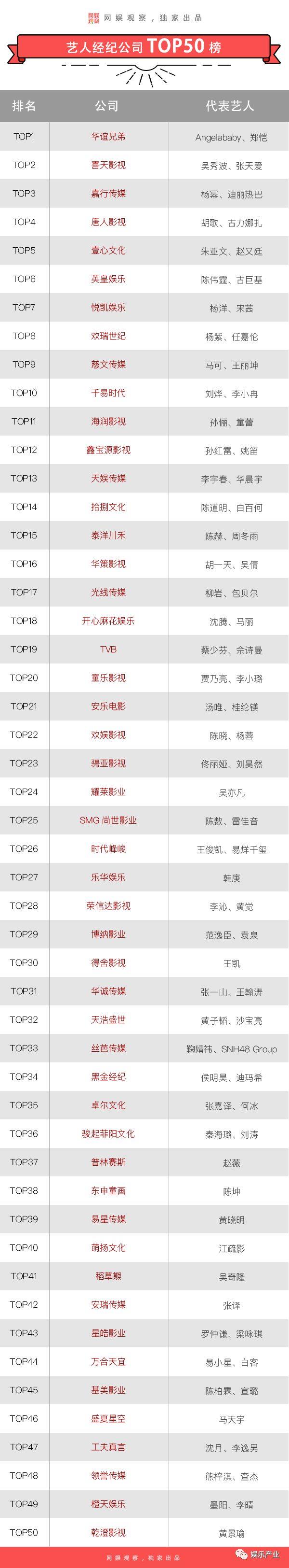 娱乐产业(ID:yulechanye)选取目前活跃艺人经纪行业靠前的50家公司,按行业影响力的大小进行排名,这50家经纪公司为中国的影视娱乐产业培养了大量的艺人中国艺人经纪公司TOP50权力榜出炉!华谊+喜天+嘉行稳居头部!,其推出的艺人是行业发展的重要资源,为各艺人经纪公司及制片方进行参考。