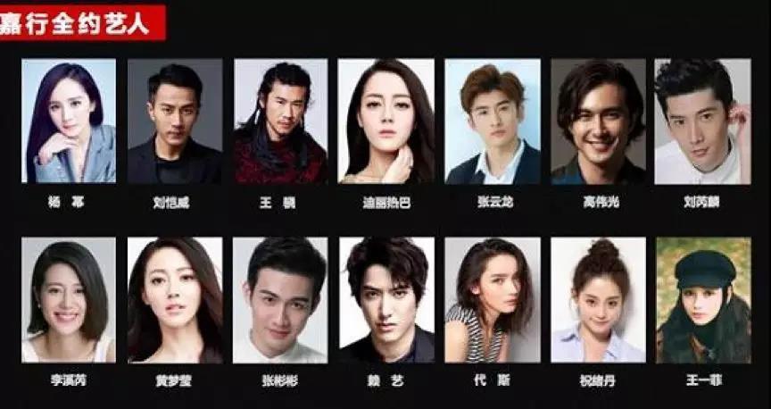 众所周知,嘉行传媒是艺人+影视两条腿的模式。嘉行对艺人按照发展程度划分为一线艺人、成熟艺人、上升期艺人、新人四个梯队,20名签约艺人各就各位。