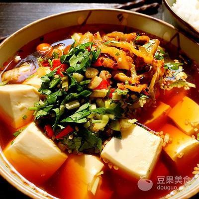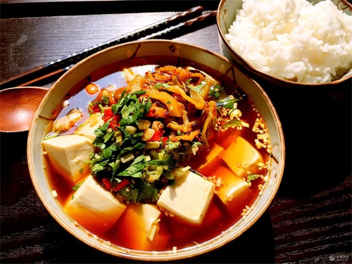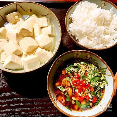 3、豆花一碗(嫩豆腐也行)煮好,热米饭一碗,豆花饭是道热食的食物