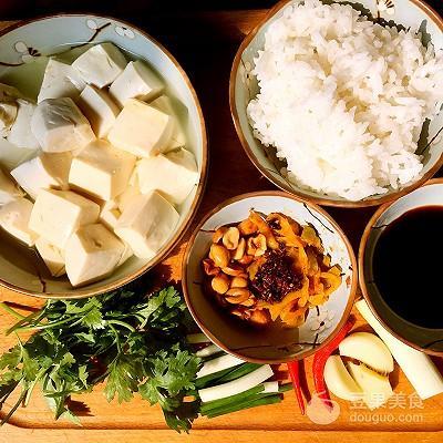 豆花(嫩豆腐也行) 一碗米饭 一碗香葱、香葱、蒜苗 适量老干妈、朝天椒 适量姜、蒜 适量炸花生米、炸黄豆 适量生抽 五勺榨菜 适量