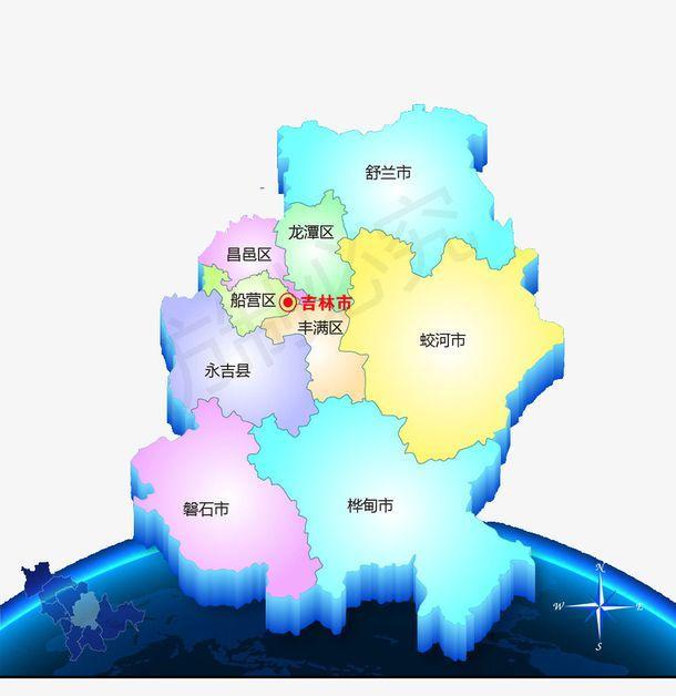 吉林市辖4个市辖区(昌邑区、船营区、龙潭区、丰满区)、4个县级市(舒兰市、磐石市、蛟河市、桦甸市)、1个县(永吉县),64个街道、23个乡和54个镇,311个社区和1397个行政村,1个国家级高新技术产业开发区和1个国家级经济技术开发区。