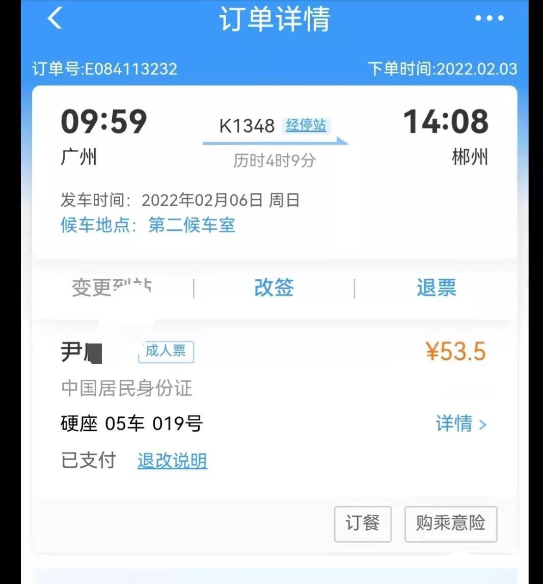2022年2月6日,是母亲返回郴州的日子,车票是2月6日9点59分,5车19号。