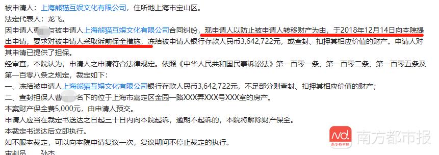 南都记者发现,2018年12月,上海市嘉定区人民法院曾支持申请人曹某“防止对方财产转移”的理由,对熊猫互娱采取诉前财产保全措施,裁定对熊猫互娱名下约364.2万元财产进行冻结。