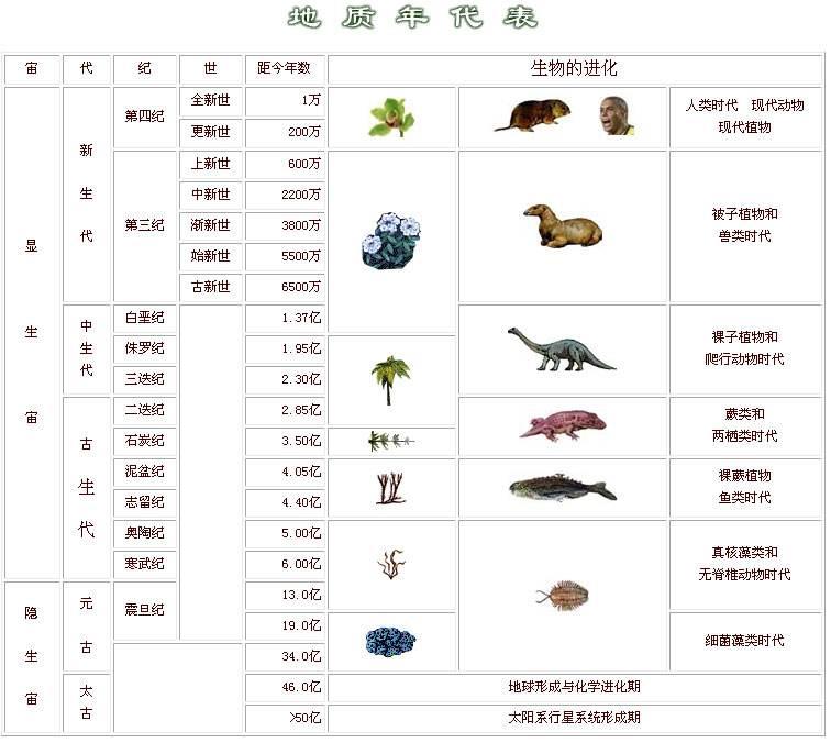 地质年代有5代12纪,5代分别是:太古代、元生代、古生代、中生代、新生代。寒武纪是显生宙的开始,白垩纪是中生代的最后一个纪,也是恐龙的灭绝时代。石炭纪是古生代的第5个纪。