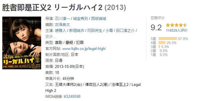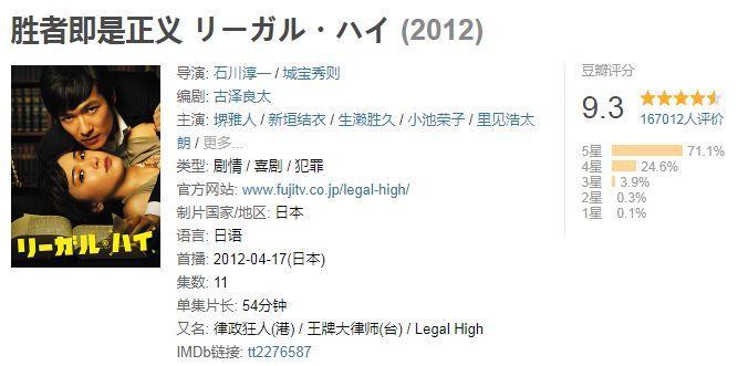 2012年《Legal High》第一部播出后瞬间口碑就刷到了一个高度,2013年拍了第二部依然保持着高口碑,现在在豆瓣上的评分一个9.3,一个9.2。