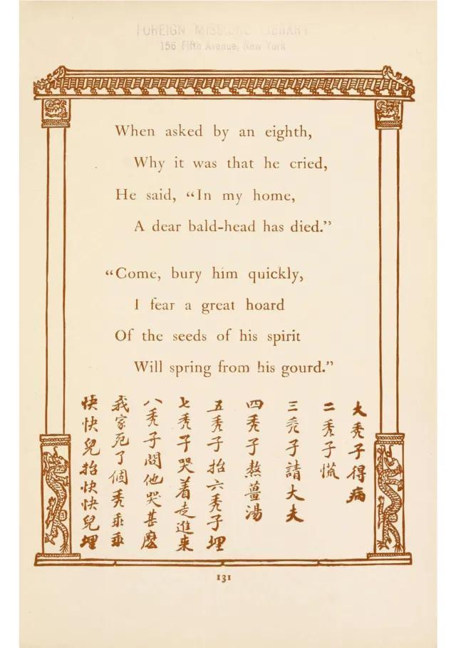 一首童谣,为什么有这样浓得惨烈又淡得凄迷的苦味?成年人的过度阐释赋予一首童谣太多的社会黑暗面这样合适吗?但这实实在在是一首童谣,据考证,其出处是北京、天津、河北一带流传着的“秃子童谣”。清朝末年旅华美国传教士何德兰(Isaac Taylor Headland)搜集了北京地区流传的一百五十首童谣,著成《孺子歌图》(Chinese Mother Goose rhymes)一书,在这一百多首童谣里,有一首名为“八个秃子”(Eight Bald-heads),与“兔子童谣”有着明显的联系,可能是关于“秃子童谣”的最早的记录。“兔子童谣”毫无疑问起源于秃子童谣,从“秃子”到“兔子”,明显是翻译的人由于南北方口音或者文化不同在传播中产生了一些差异。