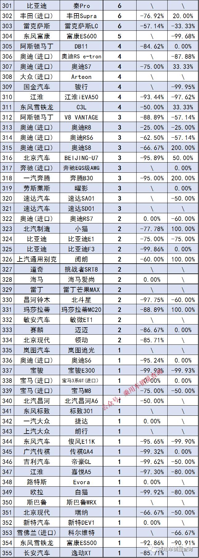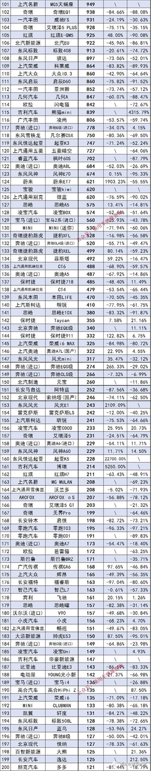 2023年1月,销量不到100辆的轿车达到150款车型。1月份355款轿车车型销量及其排名情况,详见下表: