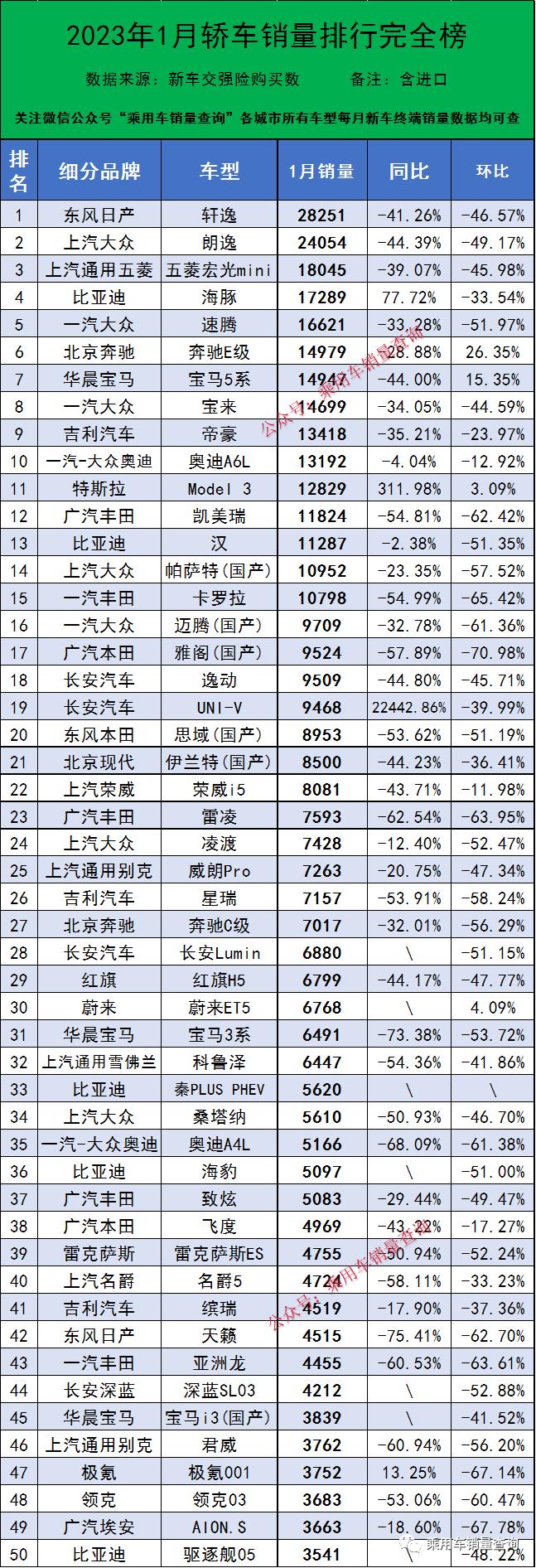 1月轿车销量排行榜,第1-355名(含进口车),轩逸夺冠,帝豪第9