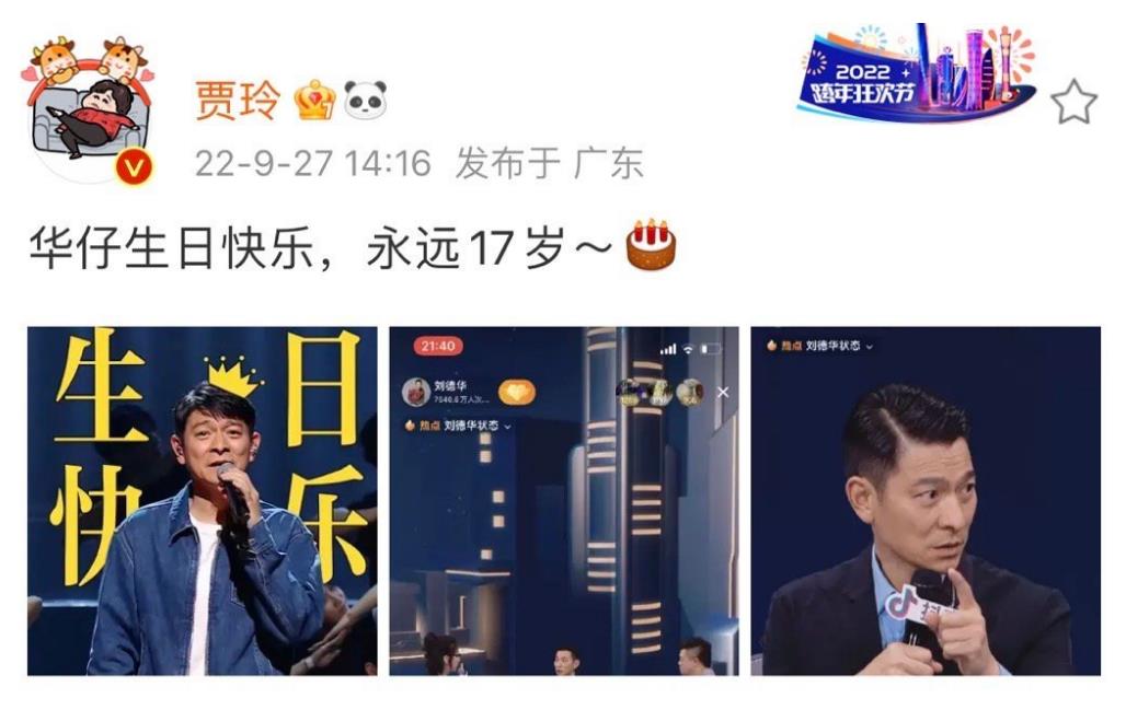 “最初喜欢你因为歌声,因为你帅气,因为你演技好。后来喜欢你,发现是因为你给我人生的指引。”贾玲说到了许多人的心声:刘德华他是明星,名副其实的偶像,也是榜样。9月27日,贾玲发文祝:华仔生日快乐,永远17岁~。