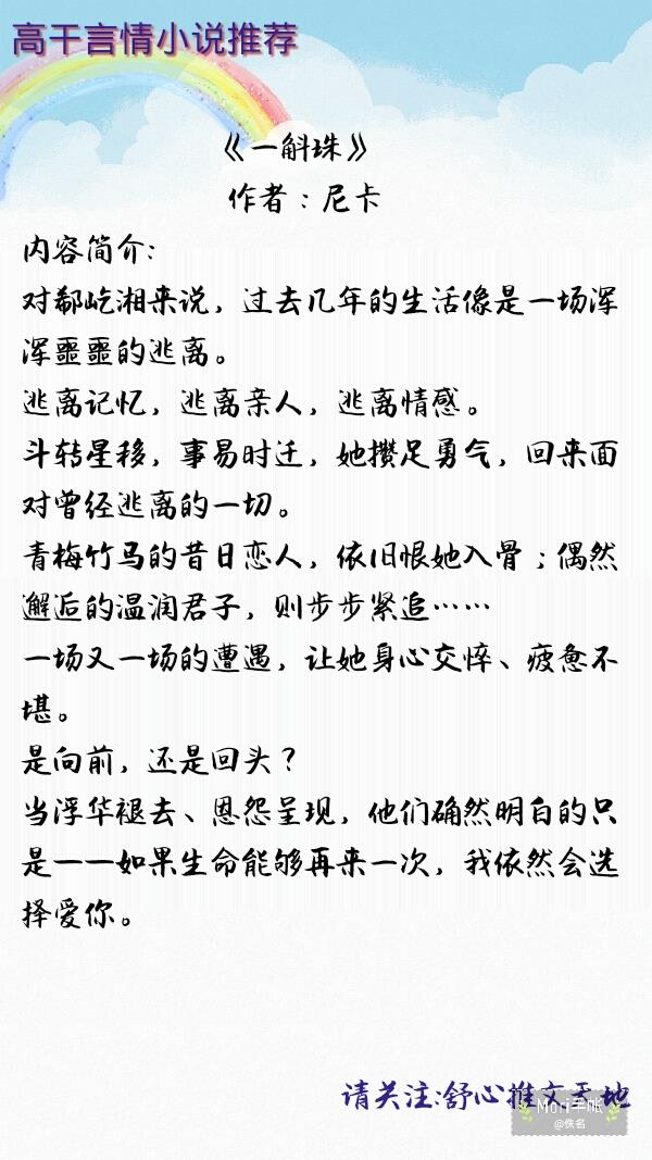 简评:老文,很长,最近又看了一次,我觉得尼卡的文都写的不错,这个讲的是青梅竹马经过无数挫折破镜重圆的故事,虐,男二挺有魅力的。尼卡的文字风格自成一派,含蓄典雅,观察入微;难得的是也很会讲故事,题材涉猎广泛,她的笔下有饮食男女的轻松明快,也有天地蜉蝣的无言隐痛。《一斛珠》节奏舒缓,细节丰富,随便点开一页就能看下去,可以很直观感受到文字之美、叙事之美。