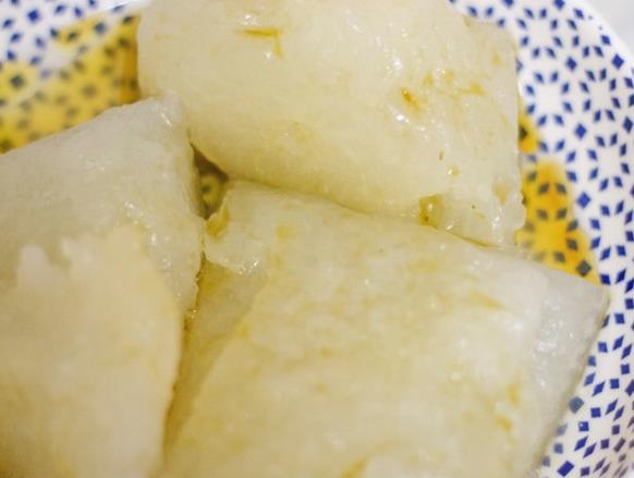 5 三天后,冬瓜发酸,变黄。用干净的勺子,取出一块,浇上麻油和糖即可食用。