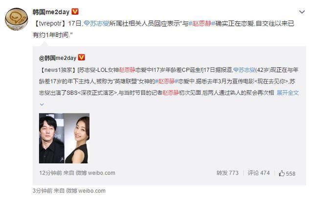 然后就在今天,有媒体报道,恩静与有17岁年龄差的韩星苏志燮确认恋爱了,并且自交往以来已有约1年时间。