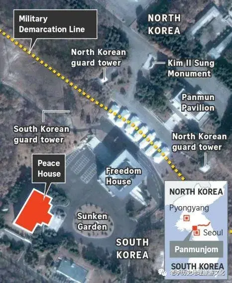 抗日战争胜利后,南北朝鲜的分界线在北纬38度的三八线。朝鲜战争之后,中国人民志愿军和朝鲜人民军才把分界线向南推进到了今天的板门店位置。板门店是朝鲜战争和朝鲜半岛分裂的见证,也是当今朝韩双方最为敏感的前线阵地。