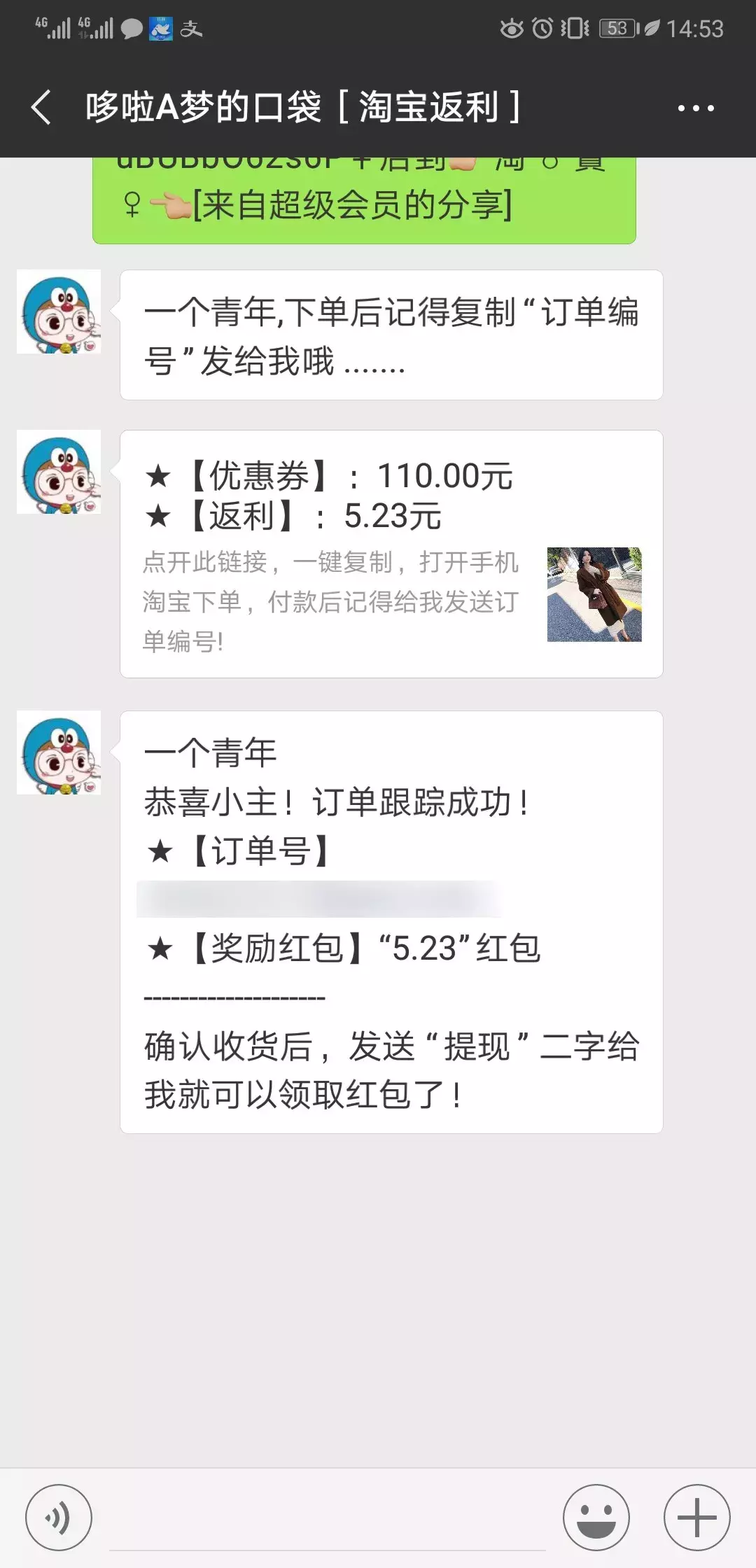我们来回顾下流程:把喜欢准备购买的商品发给这个返利微信,她会自动给你找到大额优惠券,然后把链接回复给你,我们要做的就是复制链接,下单购买就行了,真省事~