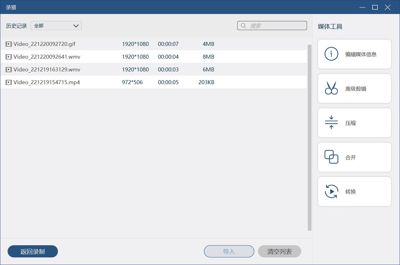 第五步:录制完成后,您将进入“历史记录”界面。您可以在此处查看或编辑您的视频文件,可对视频进行裁剪、格式转换以及压缩等。