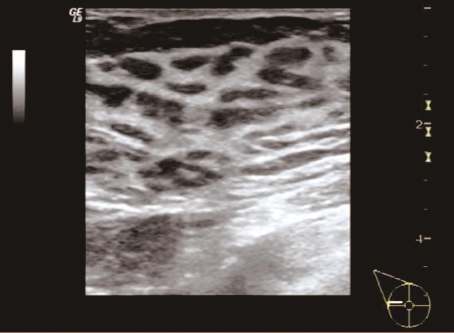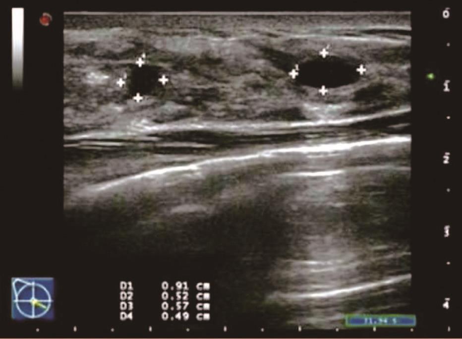 (1)单纯增生型:表现为乳腺腺体不同程度增厚,腺体内部结构稍紊乱,分布欠均匀,可见散在或弥漫分布的形态欠规则、边界欠清晰、大小不一的低回声区与稍高回声区相间,呈现“豹纹征”声像改变。可伴有钙化灶,钙化为较粗大沙砾状、杆状或小弧状,分布于乳腺局部,也可弥漫分布于整个乳腺,其内未见彩色血流信号或少许点状彩色血流信号,无明显囊肿及结节。