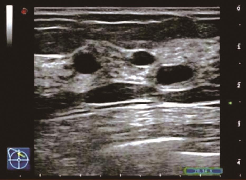 (3)囊性增生型:表现为乳腺组织回声增粗、增强,较杂乱,腺体内可见散在大小不等的圆形或椭圆形囊状无回声或长条形管状无回声区,边界清晰,壁薄光滑,透声好,内部偶见分隔回声带,也可有少许点状回声,内部无明显彩色血流信号。