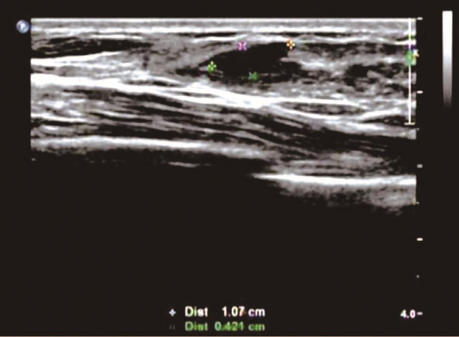 (2)腺瘤样增生型:多见于纤维腺病型,表现为乳腺腺体内单个或数个低回声结节,呈椭圆形或梭形,部分呈分叶状,边界尚清晰或欠清晰,无包膜回声,无伪足样向周围浸润,内部回声欠均匀,后方有轻度回声增强,内部可见较丰富的血流信号。